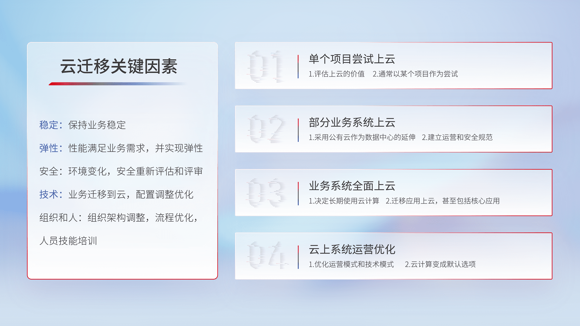 结合实际业务,,从规划设计、、、、云平台选型、、云原生改造、、、数据迁移、、、集成交付,,,,迁移全过程为客户识别最佳上云路径,,,,做好风险识别管理,,,设计网络架构、、、身份权限、、、安全审计合规、、、操作审计、、日志审计、、、、监控告警策略、、、多站点容灾设计等,,对云上基础设施进行整体规划,,,提升IT治理水平,,,,以满足弹性、、、高可用、、、、高性能的需求。。。。