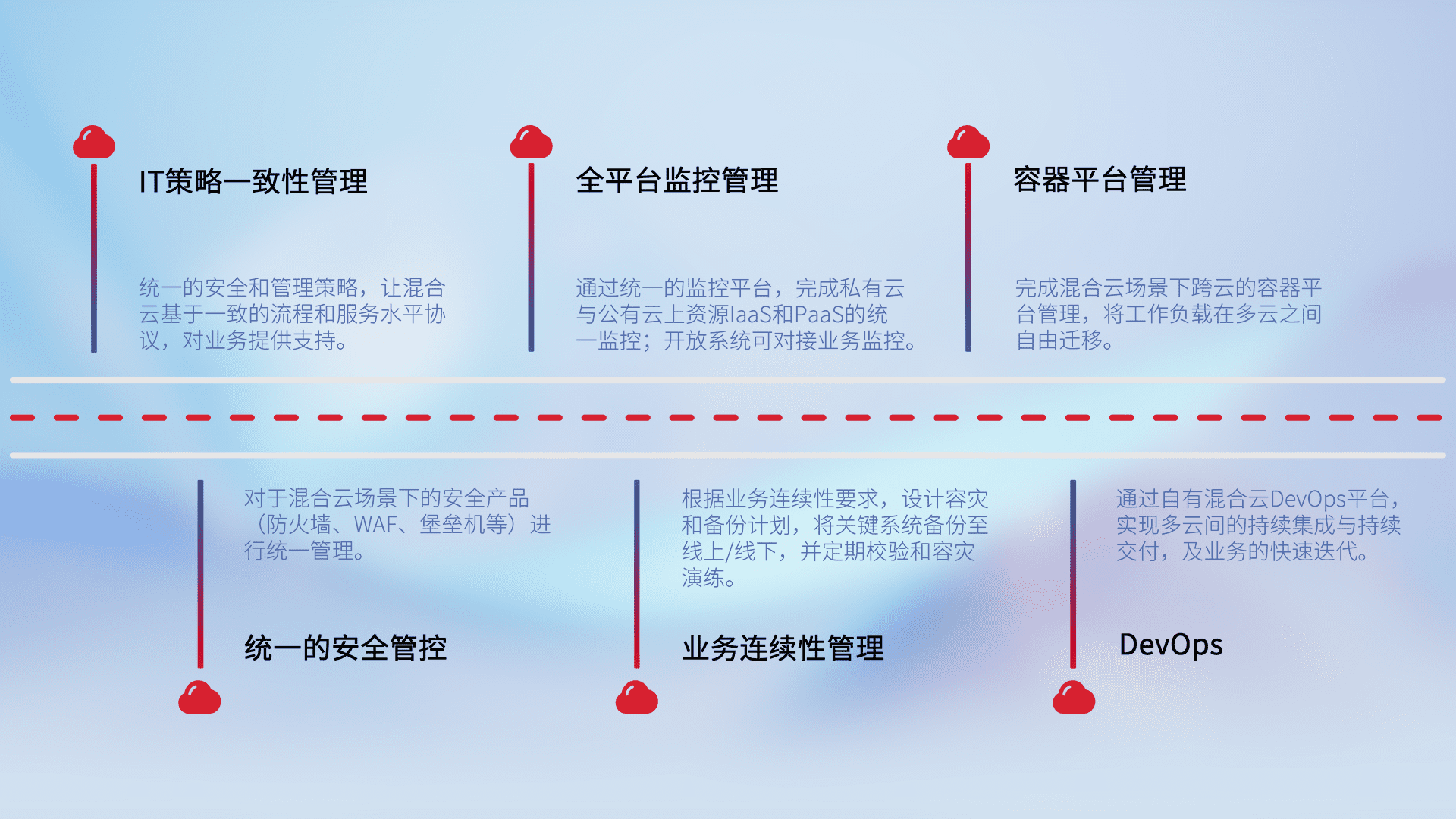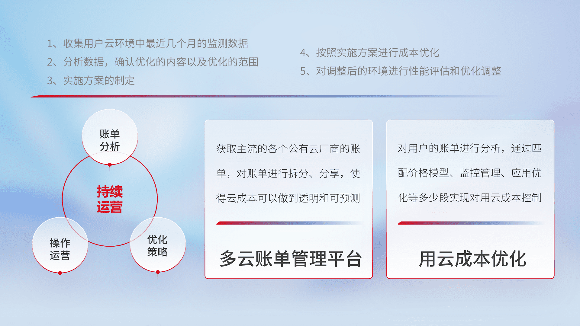 通过多云纳管,,,,以统一的资源数据模型把客户的云资源进行抽象和封装,,,,进而实现对多云资源的统一操作,,,保障云资源管理的可靠性、、、、稳定性与可用性。。。量身定制化运维内容,,,,配置、、开发运维、、、、补丁管理、、、备份、、、监控、、、、认证和访问管理、、、、审计和日常巡检等,,保障在用云过程中的可靠度,,稳定度以及高可用率。。。